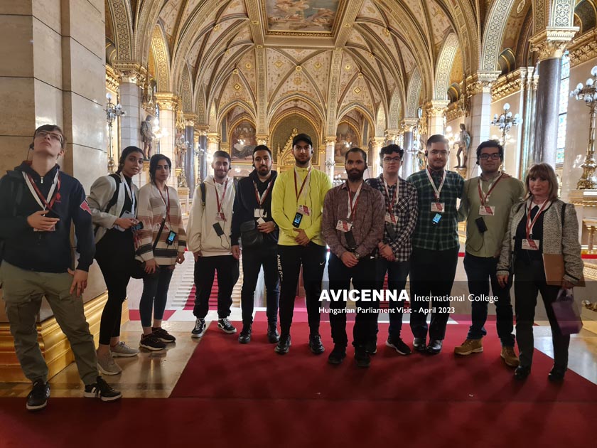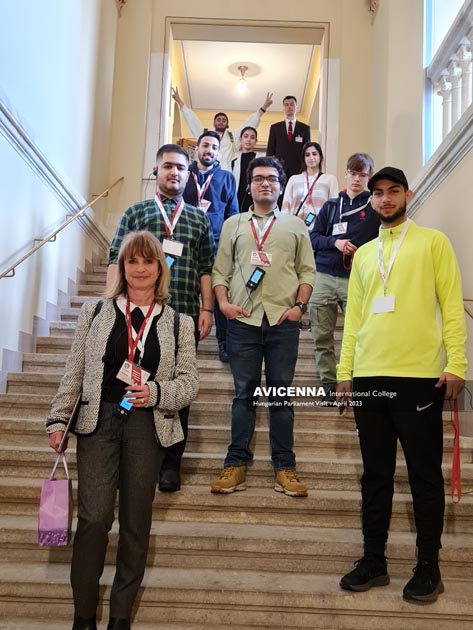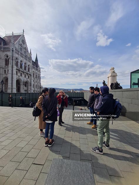 The group of ten, consisting mainly of Persian students and one Russian student, with two escorts, took a direct tram from the AIC building to the Parliament as usual. Before going into the Visitor Center, the head of the Cultural Programs, Ms. Katalin Iván, gave a briefing on the history of the square, the interesting features of the location in front of the building, as a preparation for what the students would see and hear in the Hungarian Parliament.
